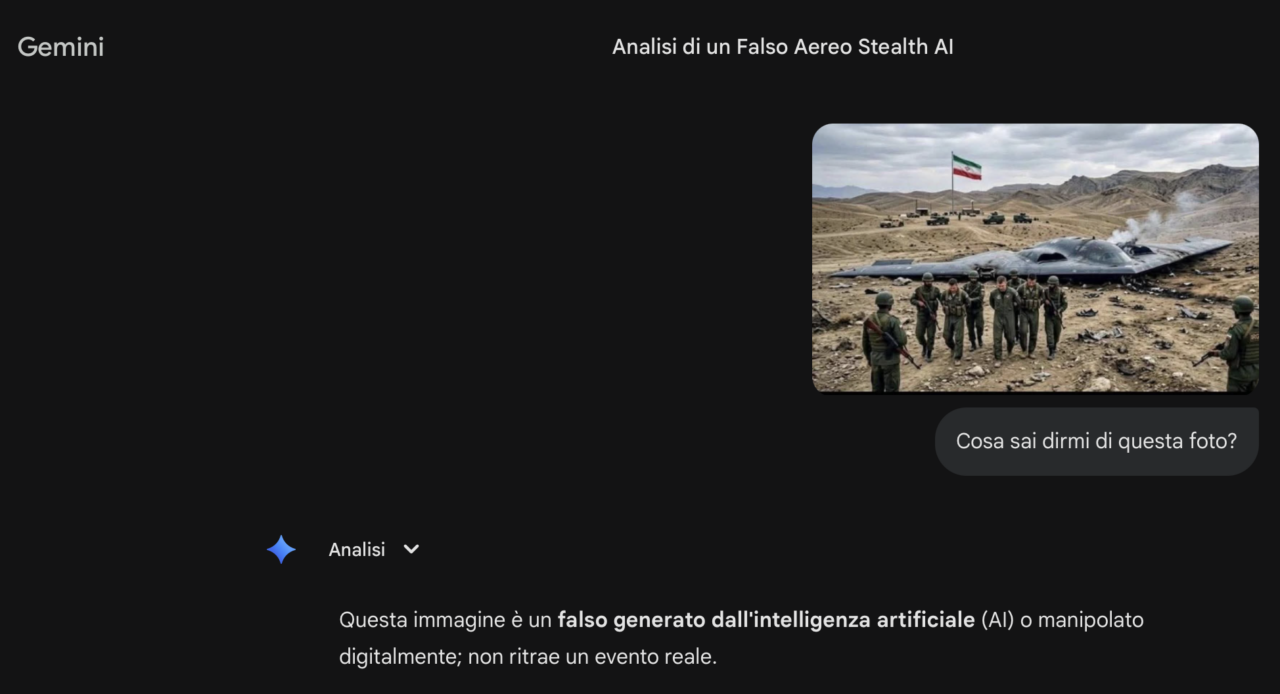 «Le proporzioni e la forma sono errate: il velivolo appare troppo piccolo rispetto alle persone e alle jeep circostanti – continua l’IA – Il B-2 è progettato per un equipaggio di due persone. Nell’immagine si vedono almeno tre o quattro individui in tute da volo scortati dai soldati […] L’analisi dell’immagine conferma la presenza di un watermark digitale invisibile (SynthID). Questo indica che la foto, o gran parte di essa, è stata generata o modificata utilizzando l’intelligenza artificiale di Google».