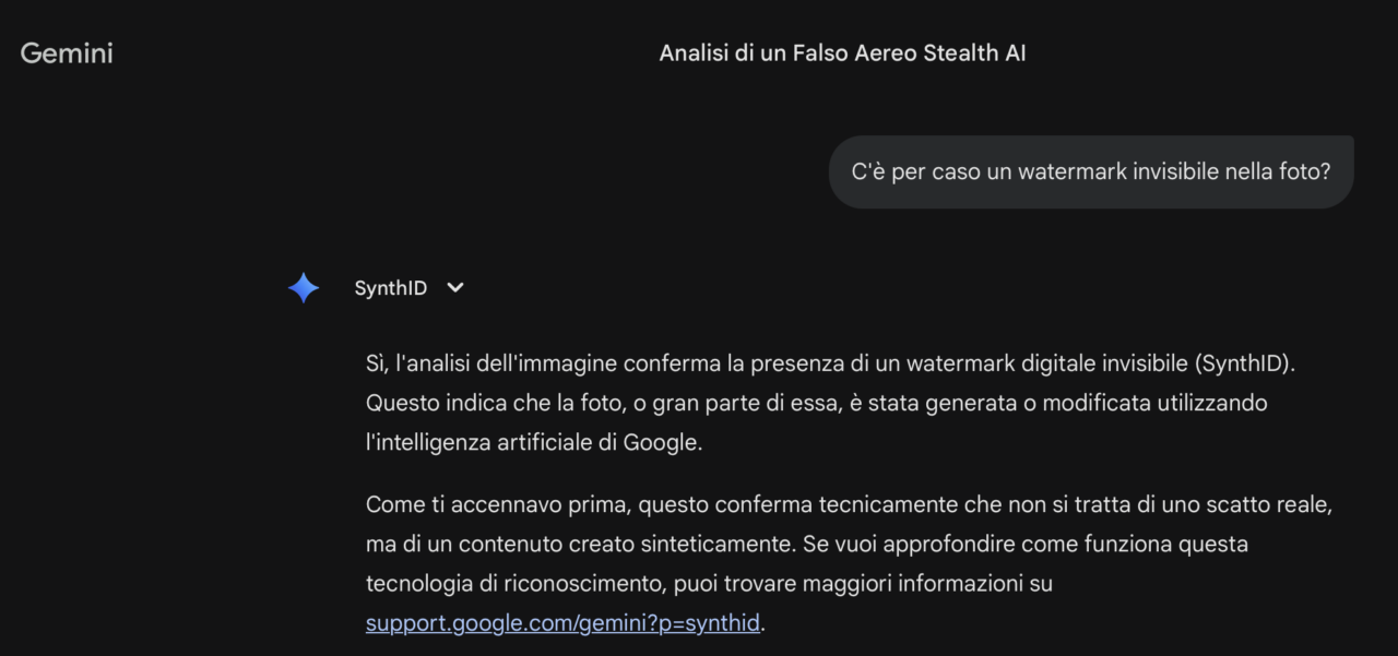 A parte le varie anomalie, come le dimensioni troppo ridotte del velivolo e i troppi piloti che vi sarebbero stati a bordo, a confermarci l’origine fasulla dell’immagine è la presenza di un SynthID, ovvero il watermark digitale invisibile che Gemini inserisce nelle immagini.