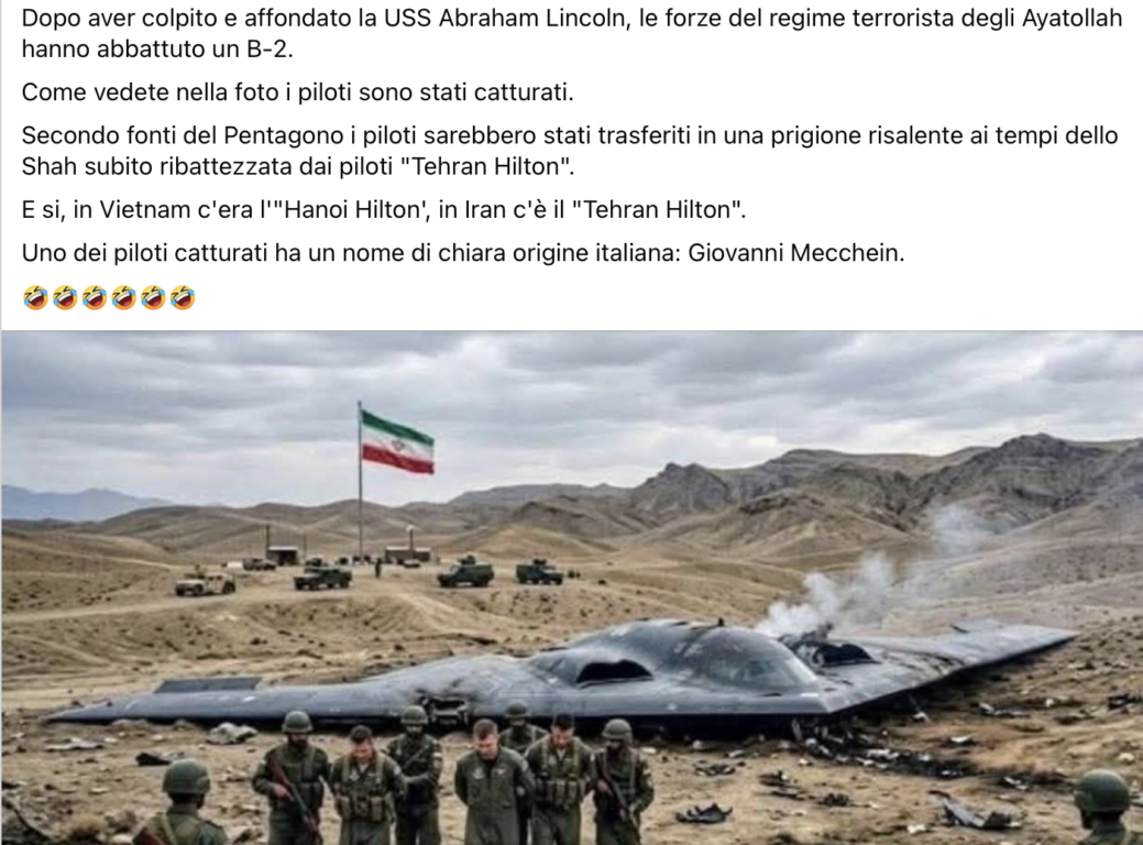 L’immagine in oggetto mostra un velivolo da guerra B-2 dell’aeronautica americana che sarebbe stato abbattuto dagli iraniani.