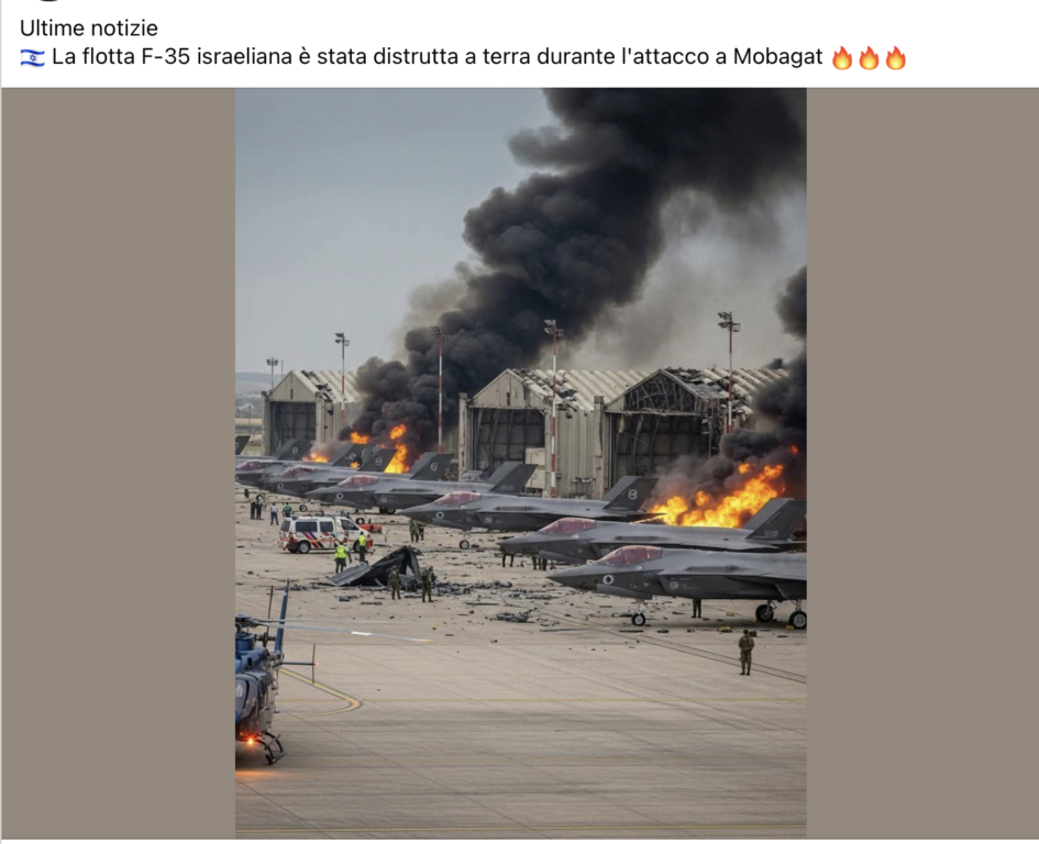 L’immagine viene accompagnata dalla seguente descrizione: «Ultime notizie 🇮🇱 La flotta F-35 israeliana è stata distrutta a terra durante l’attacco a Mobagat».