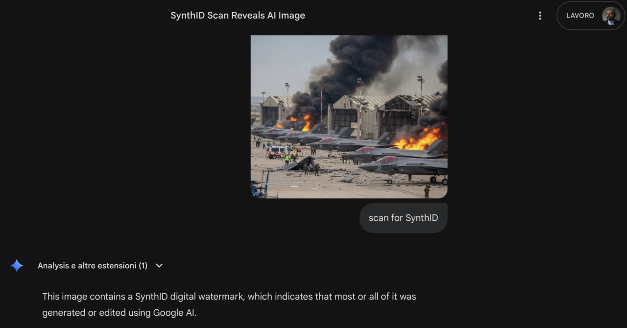 Abbiamo visto che l’immagine degli F-35 israeliani distrutti a terra a seguito di un attacco iraniano è stata realizzata mediante l’IA di Google.