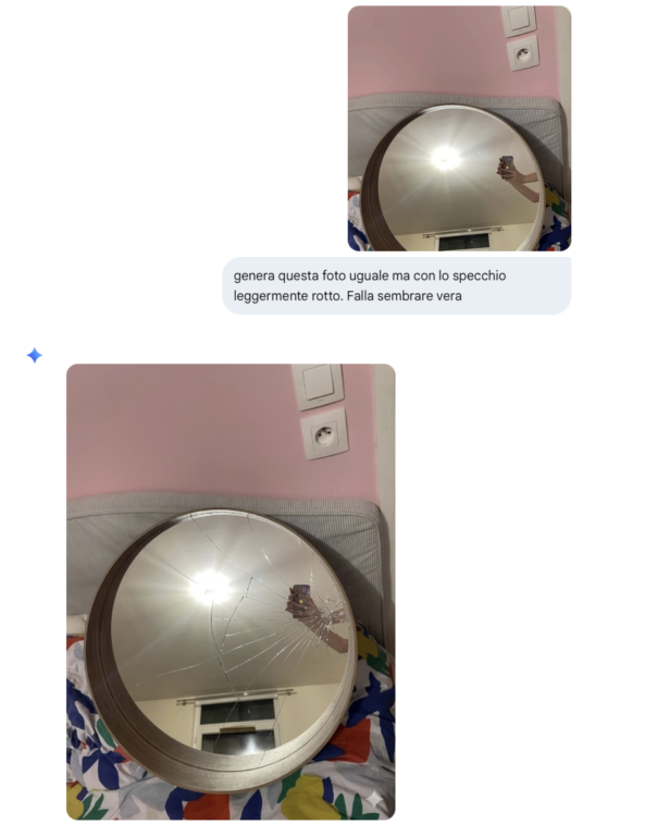 Abbiamo deciso di testare il metodo usato dai malintenzionati. Utilizzando la foto di un annuncio reale e il software Nano Banana di Gemini, si può generare in pochi secondi un’immagine realistica di uno specchio rotto, partendo da una foto di uno specchio in perfette condizioni. Basta caricare l’immagine originale e fornire un semplice prompt per avere in pochi istante una prova fotografica pronta per essere usata come prova su Vinted. Questo dimostra quanto sia veloce la tecnica e quanto possa diventare difficile per i venditori difendersi, soprattutto quando la piattaforma tende a dare priorità alle ragioni dell’acquirente.