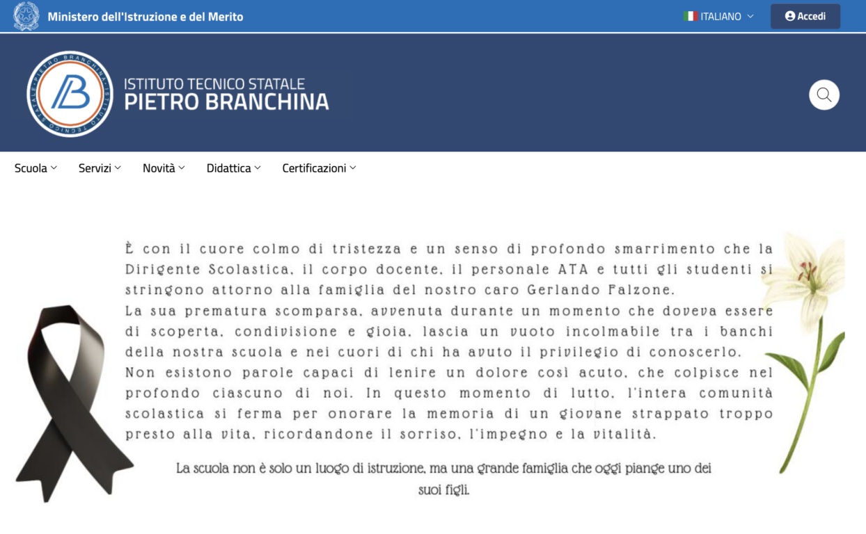 Anche la scuola frequentata dal ragazzo, l’Istituto Tecnico Superiore Pietro Branchina, ha espresso il proprio cordoglio alla famiglia. In un messaggio pubblicato sul sito dell’istituto, viene sottolineato come la scomparsa di Gerlando sia avvenuta durante un momento che doveva essere di gioia e condivisione, lasciando un vuoto profondo all’interno della comunità scolastica. La scuola lo ricorda come un giovane pieno di vita, e parla di un dolore che colpisce tutta la comunità.