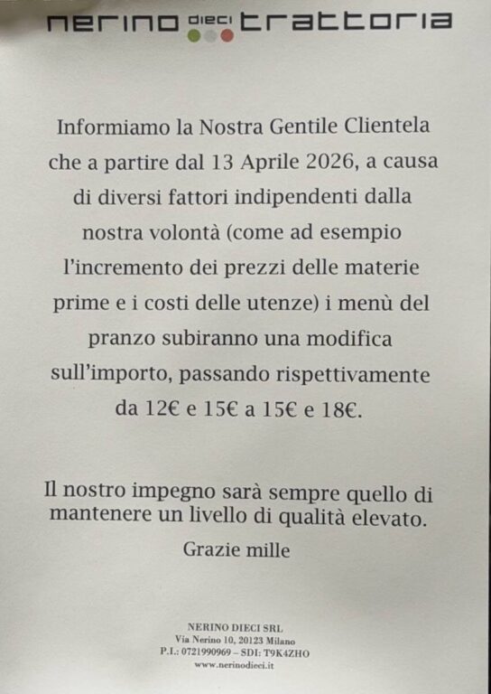 C’è un foglio A4, appiccicato con lo scotch sulla vetrina di una trattoria di via Nerino, nel pieno centro di Milano, che dice molto più di mille grafici sull’inflazione. Recita, con una cortesia che sembra figlia della volontà di giustificarsi, che da oggi, lunedì 13 aprile, il menù fisso del pranzo costa tre euro in più. La Trattoria Nerino Dieci ha ufficializzato il rincaro: il menù sale da 12 a 15 euro, quello completo da 15 a 18 euro. Le ragioni non hanno bisogno di tante spiegazioni: la proprietà cita «fattori indipendenti dalla nostra volontà», come l’impennata di materie prime e bollette dovute alle tensioni belliche nel Medio Oriente. Un aumento, sembra sottolineare questo foglio, che non è il frutto di una scelta speculativa, ma di una necessità di sopravvivenza in un momento in cui l’economia globale sembra essersi incagliata nello stretto di Hormuz.
