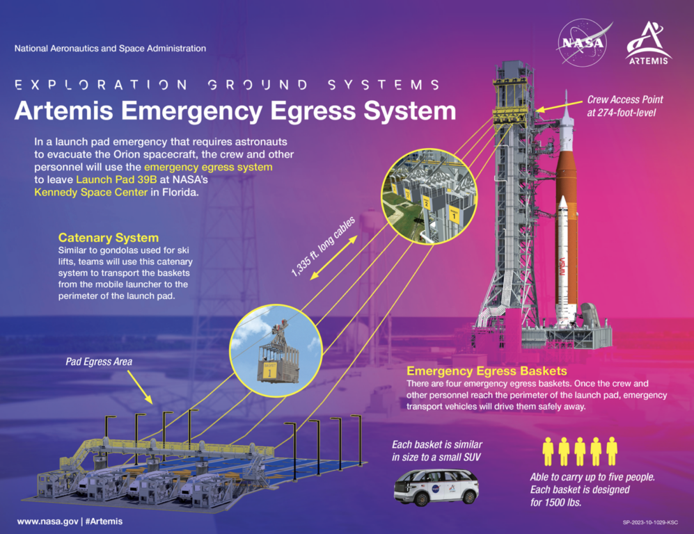 - Quella che si vede è l’Artemis Emergency Egress System, un sistema di evacuazione rapida progettato dalla NASA per mettere in salvo l’equipaggio in caso di imminente esplosione sulla rampa.