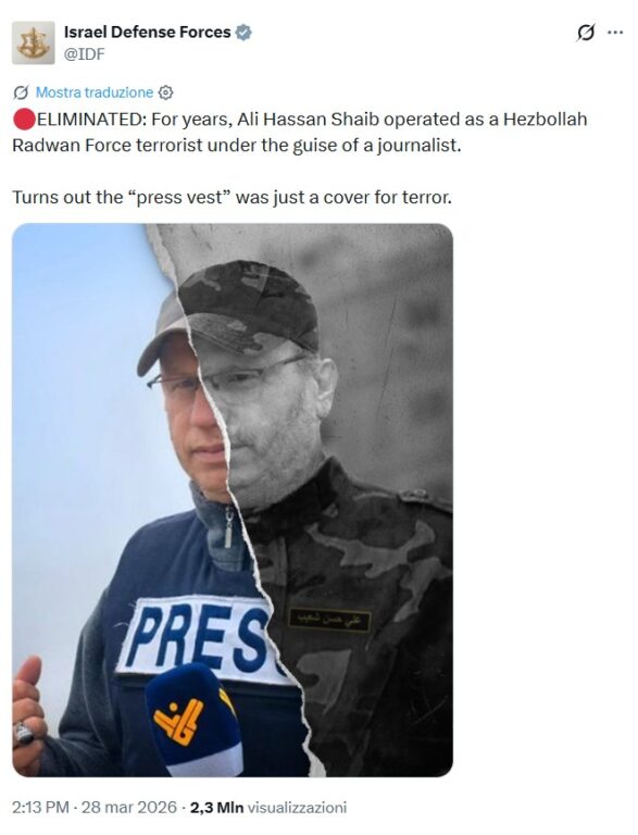 L’immagine originale, che ritraeva Shoeib con le insegne della stampa, è stata diffusa dall’IDF con un fotomontaggio che lo mostrava in assetto militare. Ad accompagnare il post, il commento ufficiale dell’esercito: «un giubbotto da stampa è solo una copertura per il terrore».
