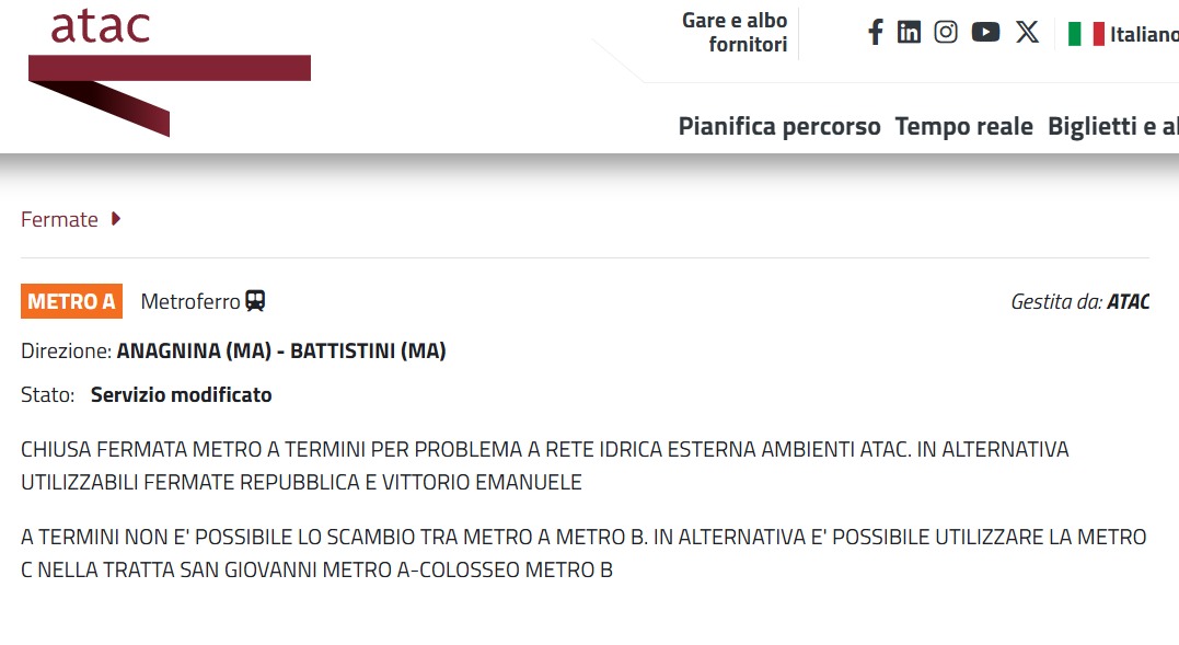 Atac ha diffuso una nota ufficiale per orientare i passeggeri: «CHIUSA FERMATA METRO A TERMINI PER PROBLEMA A RETE IDRICA ESTERNA AMBIENTI ATAC. IN ALTERNATIVA UTILIZZABILI FERMATE REPUBBLICA E VITTORIO EMANUELE. A TERMINI NON E’ POSSIBILE LO SCAMBIO TRA METRO A METRO B. IN ALTERNATIVA E’ POSSIBILE UTILIZZARE LA METRO C NELLA TRATTA SAN GIOVANNI METRO A-COLOSSEO METRO B».