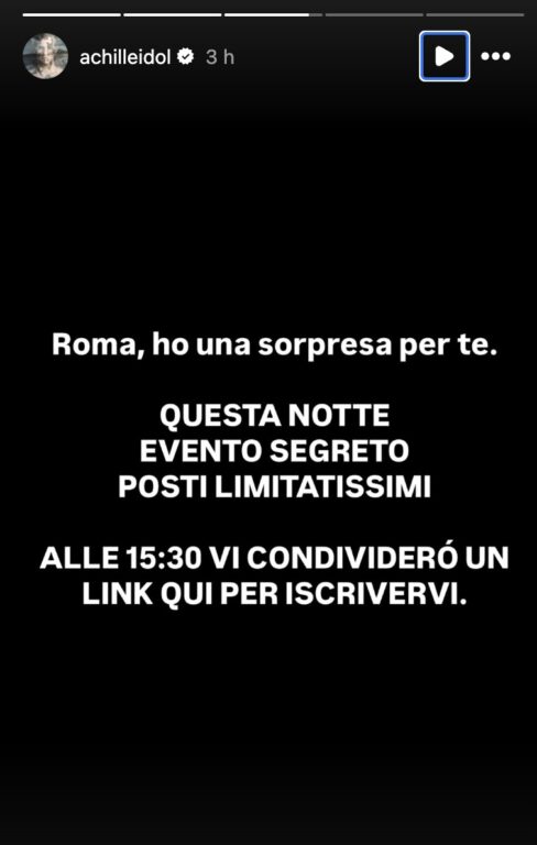 «Roma, ho una sorpresa per te». Così Achille Lauro, nelle sue stories di Instagram, invita i fan a registrarsi per un “evento segreto” che si terrà stanotte nella Capitale, lasciando però ancora segreti luogo e orario. C’è un link su cui metter i contatti. Poi, a chi si sarà registrato, verrà comunicata la location. Un evento che rischia di fare il pienone come la sorpresa che fece a Trinità dei Monti.