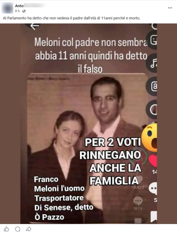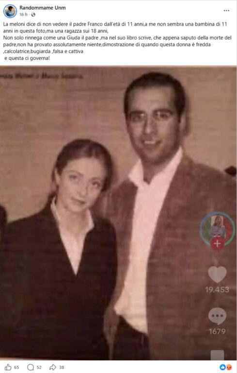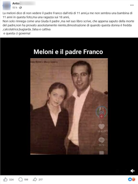Il post viene utilizzato per accusare la Premier di aver mentito sulla sua biografia, in particolare sul rapporto con il genitore: «La meloni dice di non vedere il padre Franco dall’età di 11 anni,a me non sembra una bambina di 11 anni in questa foto,ma una ragazza sui 18 anni, Non solo rinnega come una Giuda il padre ,ma nel suo libro scrive, che appena saputo della morte del padre,non ha provato assolutamente niente, dimostrazione di quando questa donna è fredda ,calcolatrice, bugiarda ,falsa e cattiva e questa ci governa!».