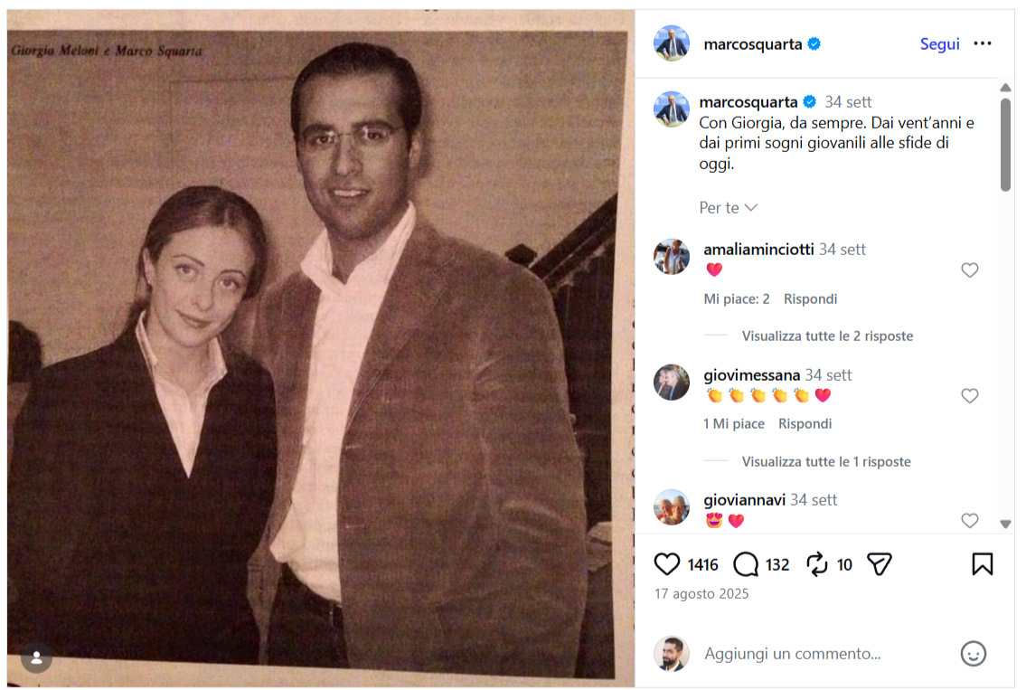 Lo scatto è stato pubblicato dallo stesso Squarta su Instagram il 17 agosto 2025 con il seguente testo: «Con Giorgia, da sempre. Dai vent’anni e dai primi sogni giovanili alle sfide di oggi».