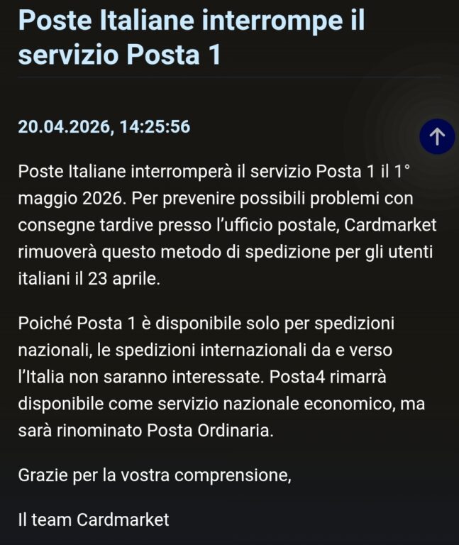 Addio a Posta1 su Cardmarket: la piattaforma leader per le carte collezionabili ha annunciato lo stop alle spedizioni veloci tracciabili dal 23 aprile 2026. La decisione anticipa di pochi giorni il ritiro definitivo del servizio da parte di Poste Italiane, previsto per il 1° maggio, lasciando migliaia di venditori di Pokémon e Magic senza l’opzione più economica.
