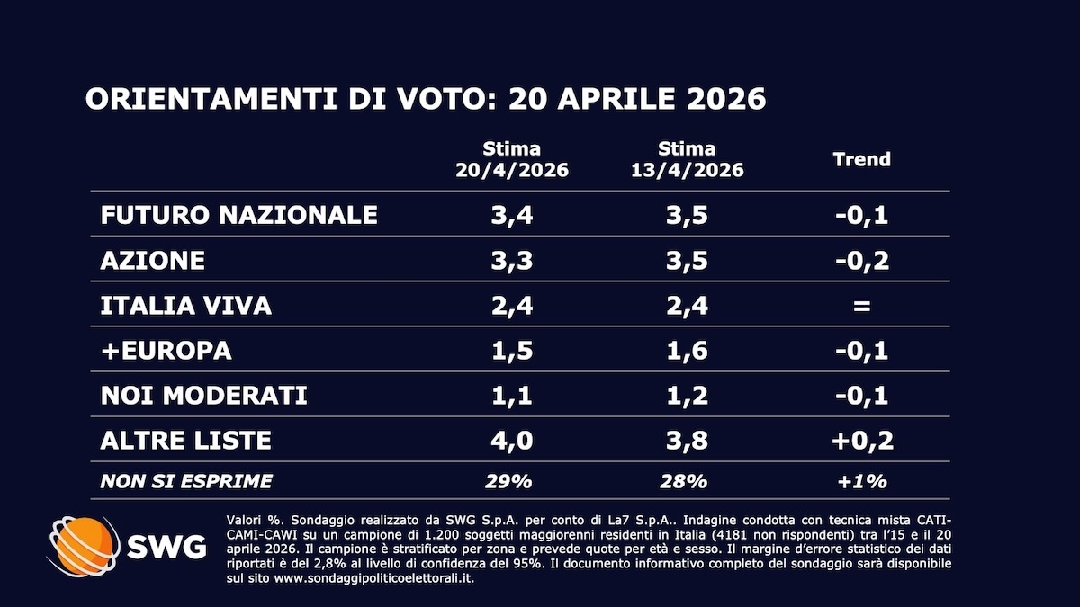 Il Pd torna a perdere terreno, così come +Europa, mentre i partiti della maggioranza di governo restano stabili o tornano a crescere. E così il centrodestra torna ad essere in vantaggio, seppur lievissimo, sul campo largo, anche senza il contributo del partito di Roberto Vannacci. È quanto mostrano i dati del nuovo sondaggio Swg per TgLa7 condotto tra il 15 e il 20 aprile. Nel dettaglio, Fratelli d’Italia è dato stabile in testa agli orientamenti di voto degli italiani al 29,3%. Nel perimetro della maggioranza guadagnano qualcosa sia Forza Italia (ora al 7,8%) che la Lega (ora al 6,5%), mentre Noi Moderati cala di un decimale all’1,1%. Risultato: oggi il centrodestra raccoglierebbe il consenso del 44,7% degli elettori. Appena di più del (futuribile) Campo Largo, in flessione al 44,6%: “colpa” soprattutto del Pd, che cala di uno 0,3% per attestarsi al 21,6% delle intenzioni di voto, neutralizzando i guadagni di Movimento 5 Stelle (ora al 12,4%) e Avs (ora al 6,7%).