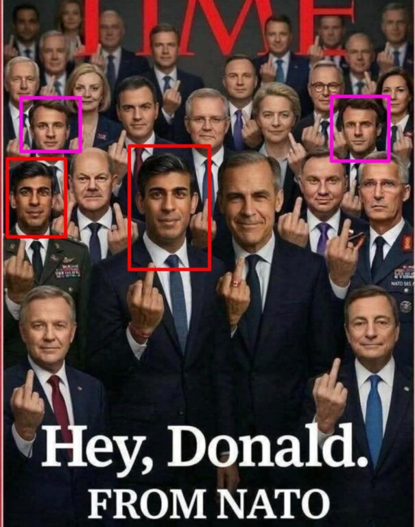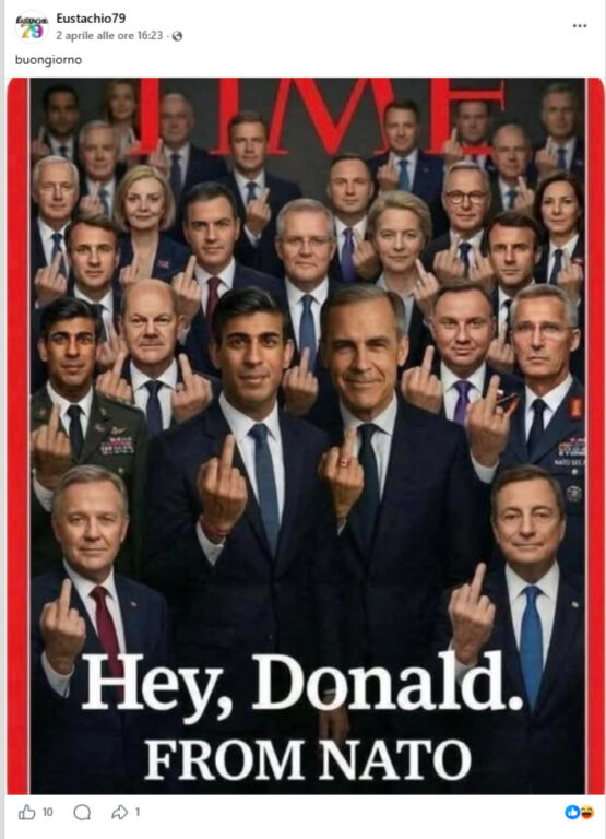 Circola sui social una presunta copertina del TIME Magazine del 2026. Nello scatto vengono raffigurati diversi leader mondiali che rivolgono il dito medio al presidente degli Stati Uniti Donald Trump, accompagnati dal titolo: «Ehy, Donald. From NATO». Non esiste alcuna copertina di questo tipo negli archivi della rivista, così come ci sono diversi elementi che riconducono alla generazione tramite AI.