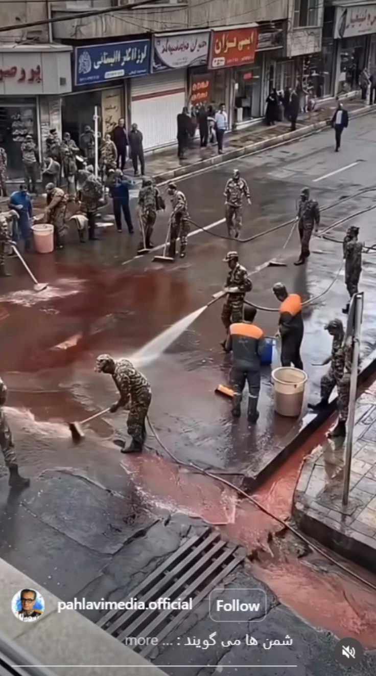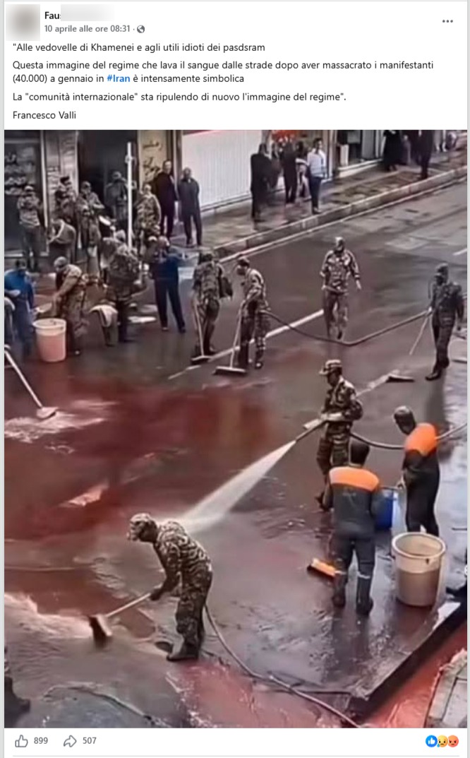 Il contenuto viene condiviso con testi come il seguente: «”Alle vedovelle di Khamenei e agli utili idioti dei pasdsram Questa immagine del regime che lava il sangue dalle strade dopo aver massacrato i manifestanti (40.000) a gennaio in #Iran è intensamente simbolica La “comunità internazionale” sta ripulendo di nuovo l’immagine del regime”».