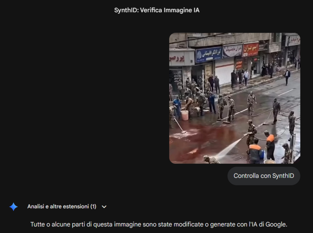 Oltre all’analisi visiva, abbiamo sottoposto l’immagine a SynthID, lo strumento di Google per l’identificazione dei contenuti generati dall’IA. Il responso è netto: «Tutte o alcune parti di questa immagine sono state modificate o generate con l’IA».