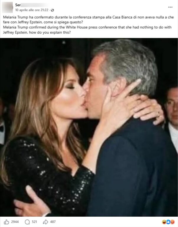 Circola una foto che ritrae Melania Trump mentre bacia in pubblico Jeffrey Epstein. L’immagine viene utilizzata per accusare Melania di aver mentito sul suo passato e sui suoi legami con Epstein. Tuttavia, si tratta di un contenuto falso, generato interamente tramite l’Intelligenza Artificiale.