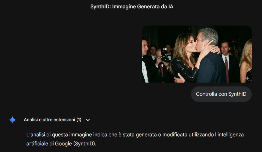 Lo strumento SynthID, progettato specificamente per identificare i watermark e i segnali digitali lasciati dall’AI di Google, ci conferma che si tratta di un’immagine generata.