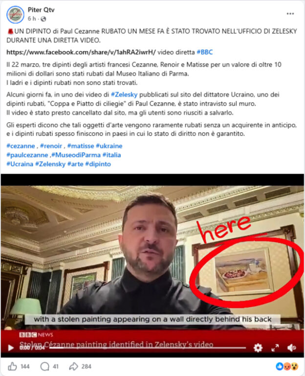 Il contenuto viene diffuso su Facebook accompagnato da un testo che recita: «UN DIPINTO di Paul Cezanne RUBATO UN MESE FA È STATO TROVATO NELL’UFFICIO DI ZELESKY DURANTE UNA DIRETTA VIDEO. […] Alcuni giorni fa, in uno dei video di #Zelesky pubblicati sul sito del dittatore Ucraino, uno dei dipinti rubati, “Coppa e Piatto di ciliegie” di Paul Cezanne, è stato intravisto sul muro».