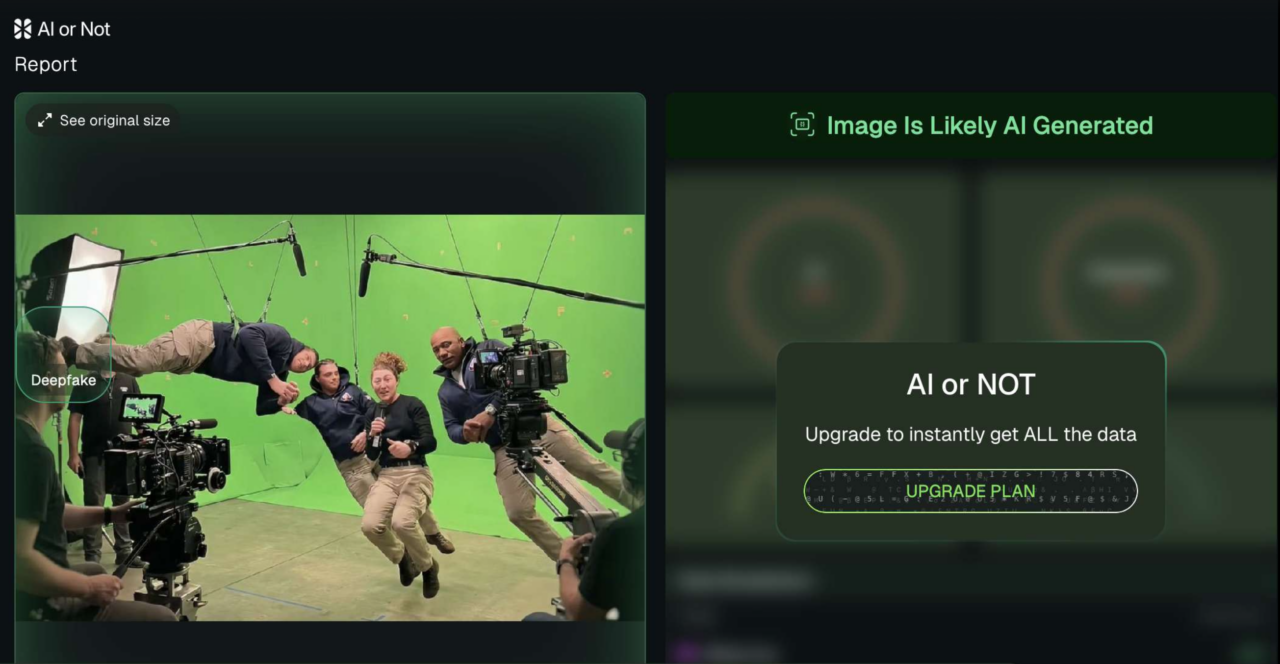 A parte le evidenti anomalie, come quella dove si vede il capitano Reid Wiseman (al centro nella foto) palesemente “scontornato” nel fianco destro, con la mano che risulta staccata dal corpo e la totale assenza del resto del braccio, a confermarci che si tratta di un falso generato con l’ausilio di una Intelligenza artificiale è lo stesso detector online AI or Not: