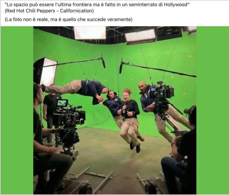 Chi condivide l’immagine riporta la seguente didascalia: «”Lo spazio può essere l’ultima frontiera ma è fatto in un seminterrato di Hollywood” (Red Hot Chili Peppers – Californication). (La foto non è reale, ma è quello che succede veramente)». Insomma, anche ammettendo che l’immagine non sia autentica, la si continua a condividere in quanto rappresenterebbe una narrazione corretta.