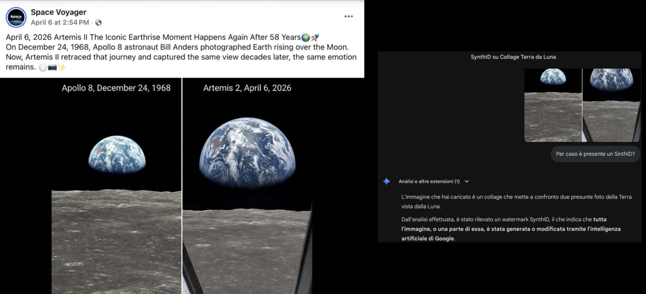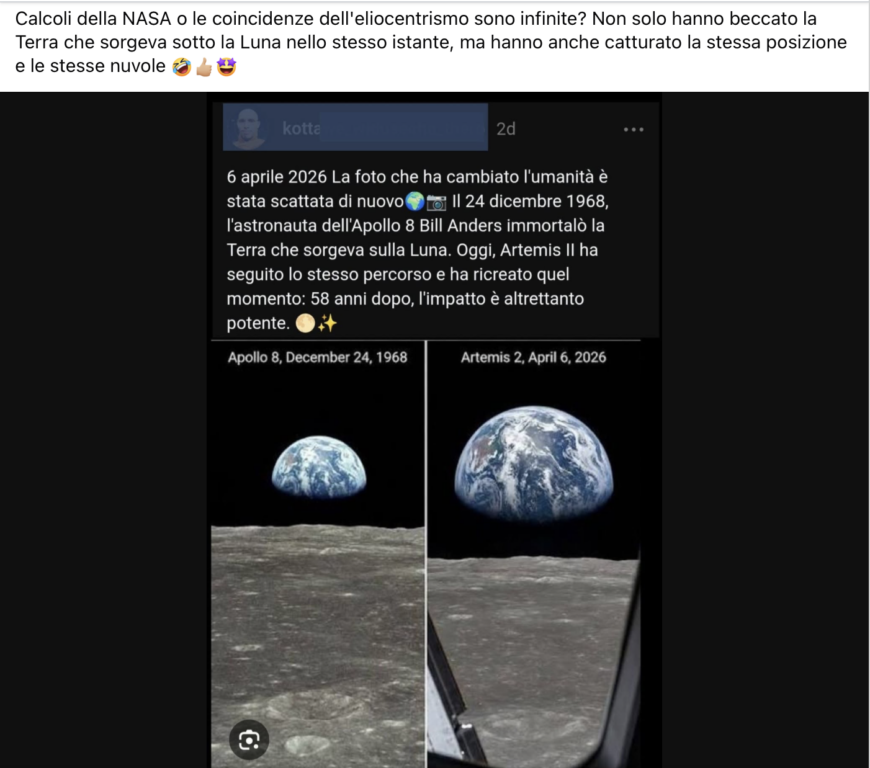 Diverse condivisioni Facebook riportano un presunto accostamento fotografico tra l’immagine della Terra vista dalla Luna della missione Apollo 8 del 1968 e quella che sarebbe stata scattata durante la missione Artemis II. Ci sono tante similitudini che hanno portato a ritenerla una prova di contraffazione. Effettivamente è così, l’immagine attribuita all’ultima missione lunare è generata con l’Intelligenza artificiale. Ma i complotti lunari non c’entrano.
