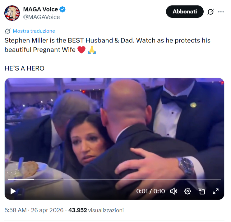 Circola sui social l’immagine di Stephen Miller, consigliere di Donald Trump, mentre si allontana concitato da una sala insieme alla moglie Katie. Secondo la narrazione che accompagna il post, Miller starebbe usando la consorte, in stato di gravidanza, come «scudo umano» per proteggersi dai colpi esplosi durante l’attentato all’ex Presidente dell’aprile 2026. Si tratta di una notizia falsa, frutto di una interpretazione distorta della dinamica dei fatti.
