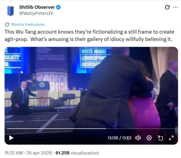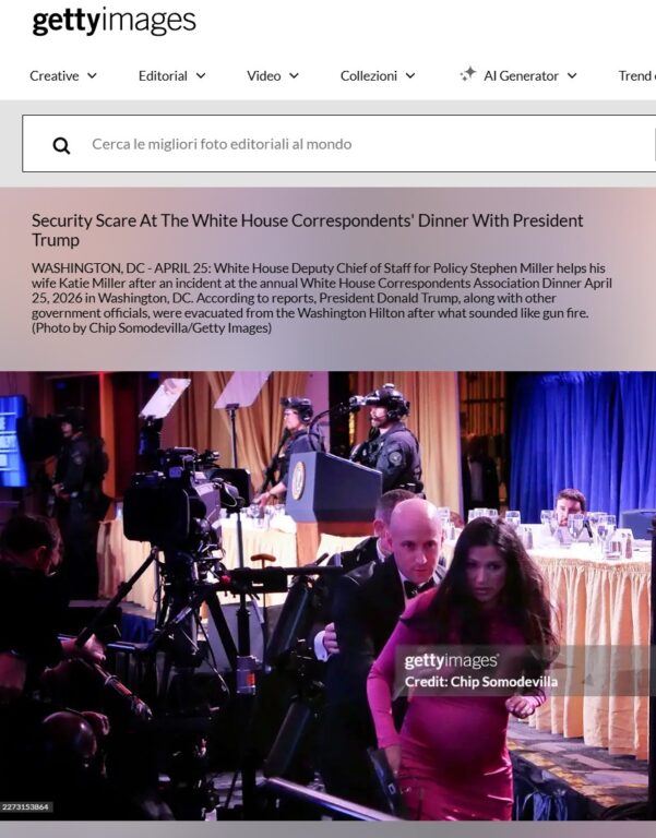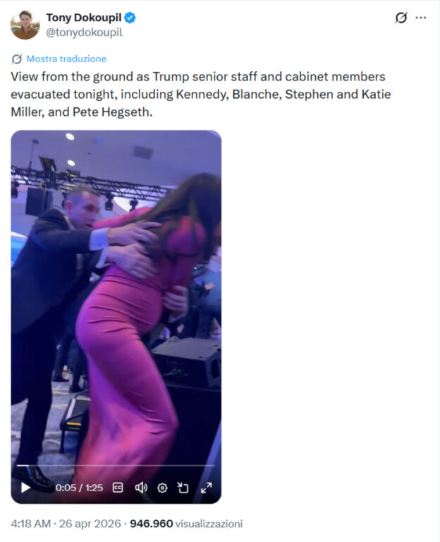 Di fatto, la fuga è avvenuta con le spalle rivolte verso la posizione in cui si trovava Cole Tomas Allen. Pertanto, dalle immagini si vede chiaramente che Stephen Miller e l’agente del Secret Service camminano proteggendo in particolar modo Katie Miller.