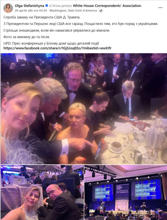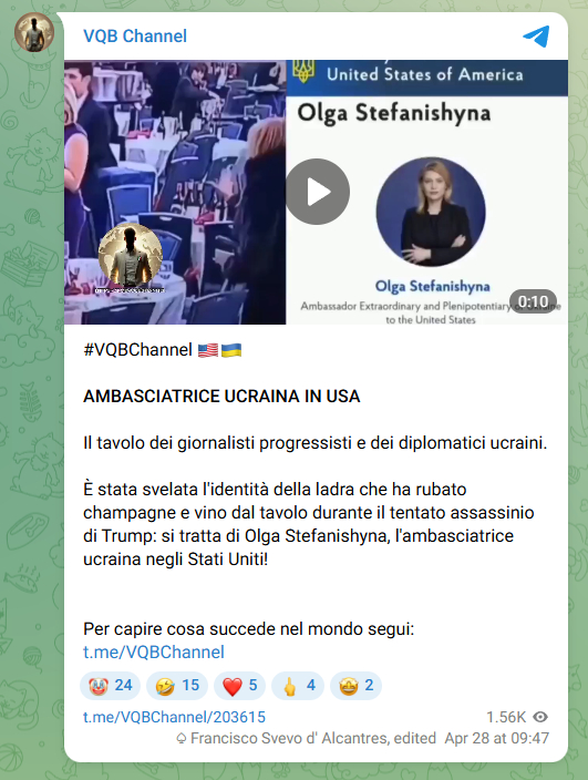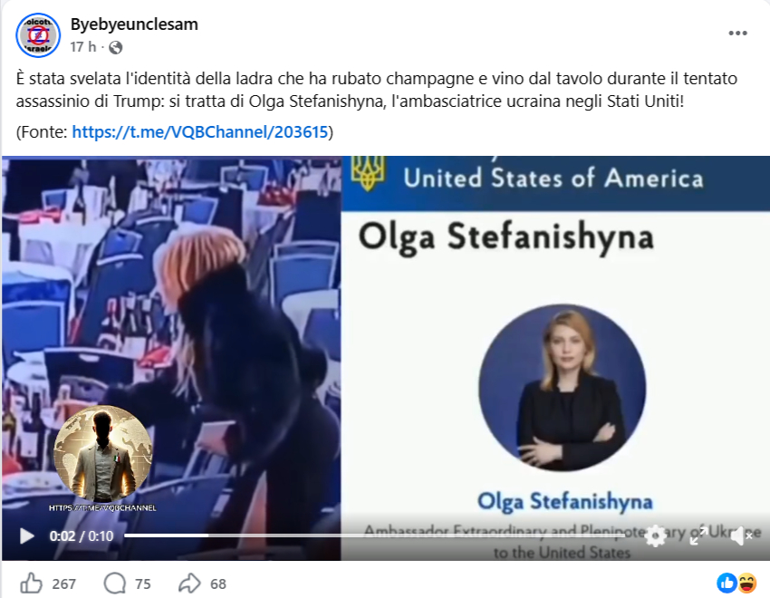 La narrazione diffusa dal canale Telegram è stata ripresa e rilanciata via Facebook: «È stata svelata l’identità della ladra che ha rubato champagne e vino dal tavolo durante il tentato assassinio di Trump: si tratta di Olga Stefanishyna, l’ambasciatrice ucraina negli Stati Uniti!».