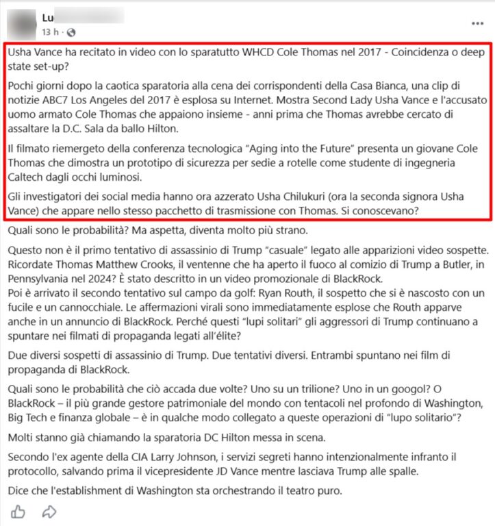 Secondo i post circolati online, il video mostrerebbe un giovane attentatore (indicato nei post come Cole Thomas, studente del Caltech) e Usha Chilukuri (ora Usha Vance) nello stesso contesto. Secondo la narrazione, ci potrebbe essere un legame pregresso tra la famiglia Vance e l’attentatore, alimentando la tesi di un complotto pianificato da tempo (“Deep State set-up”). Il claim si basa esclusivamente sulla presunta somiglianza visiva tra una donna che parla al pubblico nel servizio e la moglie del candidato Vicepresidente.