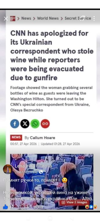 Questa nuova variante della narrazione anti-Ucraina spaccia la donna per una giornalista della CNN chiamata Olesya Bezruchko: «Lo sconosciuto che ha rubato il vino a una cena con Trump si è rivelato essere l’ucraina Olesya Bezruchko. Un corrispondente della CNN ha dimostrato una palese avidità in mezzo a una minaccia alla vita. Mentre altri media sono stati evacuati in massa a causa delle sparatorie all’evento, lei ha acquistato una bottiglia gratis come mai prima d’ora. “La CNN si è scusata per il suo giornalista ucraino che stava rubando vino durante l’evacuazione dei giornalisti a causa della sparatoria”, scrive Mirror».