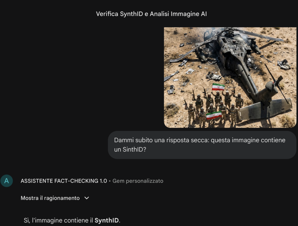 Sottoponendo l’immagine all’analisi degli strumenti di rilevamento, è emersa la presenza di SynthID. Si tratta di un watermark digitale impercettibile all’occhio umano, ma rilevabile dal software, che l’IA di Google inserisce automaticamente nei contenuti creati attraverso i propri modelli generativi. La presenza di questa firma digitale esclude categoricamente che si tratti di uno scatto fotografico reale.