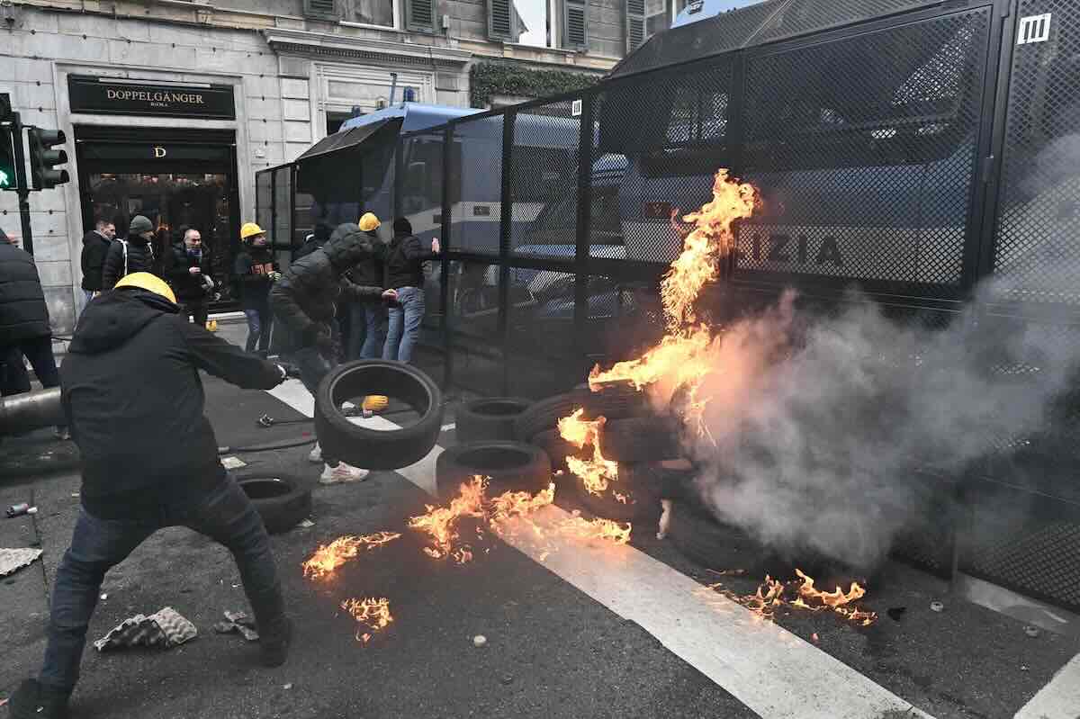 La manifestazione della Fiom contro la smobilitazione dell’industria dell’acciaio. Pneumatici in fiamma, lacrimogeni sugli attivisti Fiom